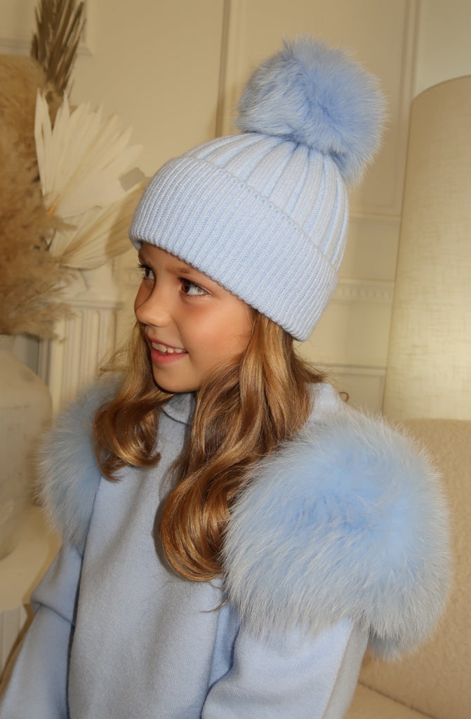 Childrens Baby Blue Luxury Fur Bobble Hat