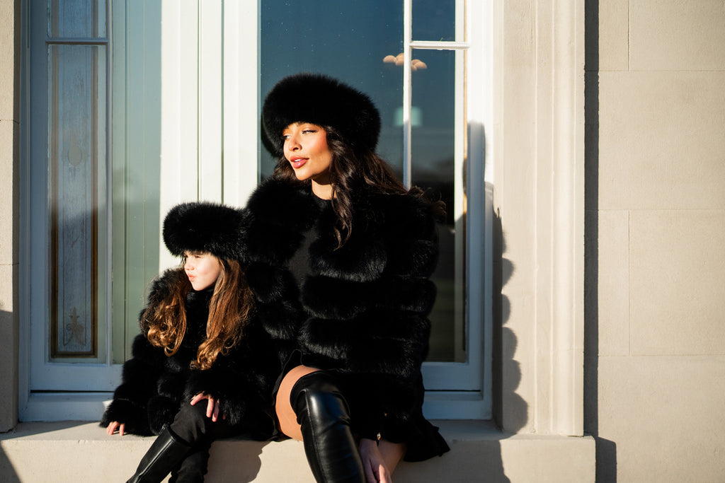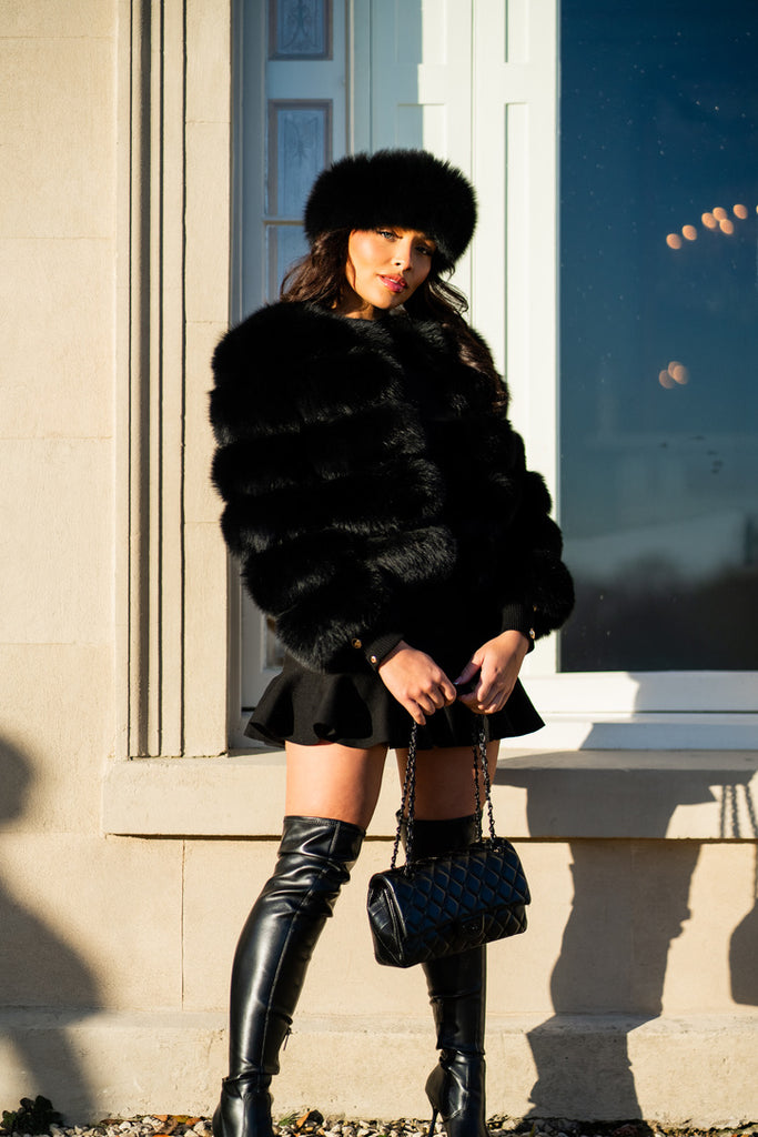 The Black Luxury Fur Jacket showcases expert craftsmanship with its genuine real fur and distinctive 5-row horizontal design, adding texture and depth. Cropped sleeves offer a sleek, modern silhouette, while the hook and eye fastening delivers a secure and subtle closure. This jacket exemplifies refined elegance for sophisticated outerwear.