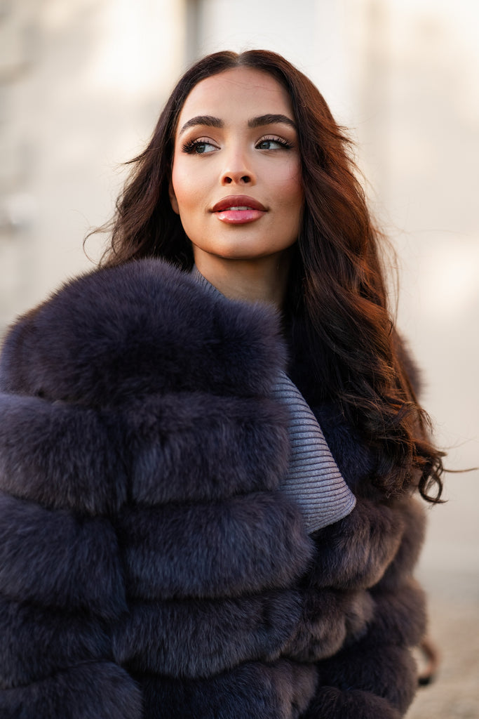 The Charcoal Luxury Fur Jacket is expertly crafted from genuine real fur and features a sophisticated 5-row horizontal design that adds depth and texture. Its cropped sleeves create a refined, modern silhouette, while the hook and eye fastening ensures a secure and discreet closure. This jacket offers a perfect blend of luxury and tailored elegance.